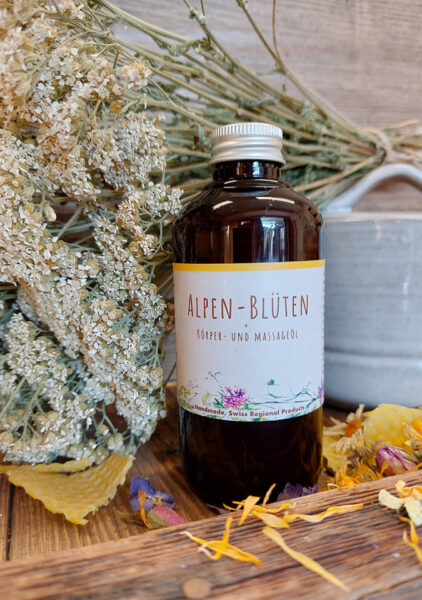 Alpenblüten-Öl ist ein Mazerat (öliger Auszug) aus Alpenblüten & Kräuter (frisch) mit Bio-Olivenöl. Bewährt zur allgemeinen, äusserlichen Hautpflege, bei beanspruchten Hautstellen durch Arbeit, Haushalt und Sport sowie rauen und trockenen Händen und Füssen. Spendet Feuchtigkeit, beruhigt gereizte und empfindliche Haut. Auch als Massage- und Badeöl geeignet.
