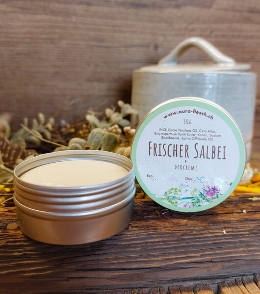Die Deocreme Frischer Salbei aus der praktischen Dose bietet mit Kokosöl und Sheabutter die perfekte Pflege für empfindliche Achselhaut. Sie sollte aber nicht direkt nach der Rasur angewendet werden. Für frischen Duft sorgen wertvolle ätherische Öle, die aus Salbei gewonnen werden. Es ist denkbar einfach anzuwenden. Massieren Sie bei Bedarf eine kleine Menge in die Achselhaut ein. Schon entfaltet sich der frische Duft und schützt vor Körpergeruch. Deocreme Frischer Salbei ist nicht vegan (Bienenwachs). Deocreme ist ohne Aluminiumsalze, Parabene, Silikone, Paraffine und Mineralöle.